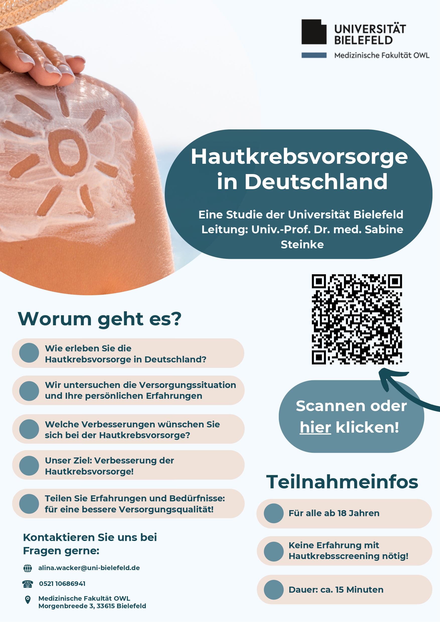 Die Universität Bielefeld führt derzeit eine wissenschaftliche Studie zur Versorgungssituation in der Hautkrebsvorsorge durch. Ziel ist es herauszufinden, wie Menschen das Hautkrebsscreening nutzen, welche Erfahrungen sie damit gemacht haben und welche Bedürfnisse bestehen. Bislang gibt es dazu nur wenige Daten in Deutschland, weshalb diese Forschungslücke genauer untersucht wird.
