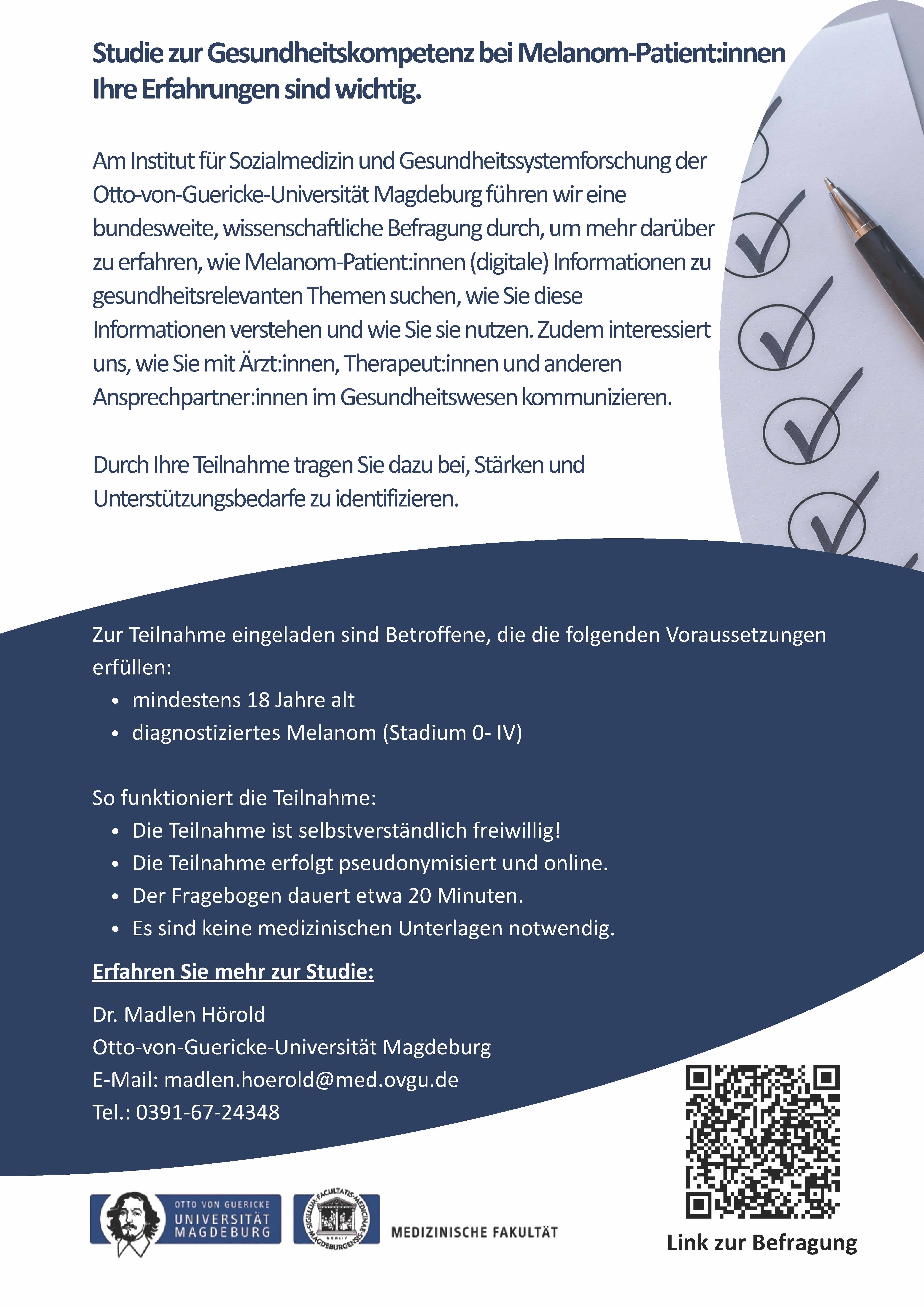 Das Institut für Sozialmedizin und Gesundheitssystemforschung der Otto-von-Guericke-Universität Magdeburg führt eine bundesweite, wissenschaftliche Befragung zur Gesundheitskompetenz von Menschen mit einem Melanom durch.