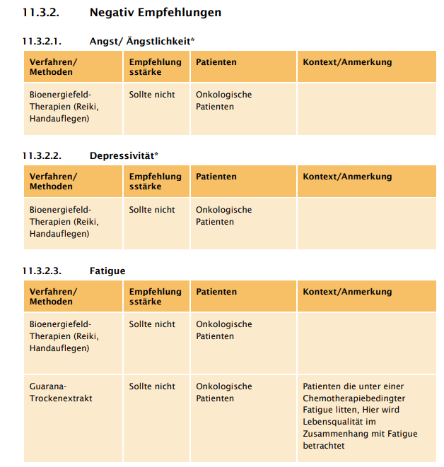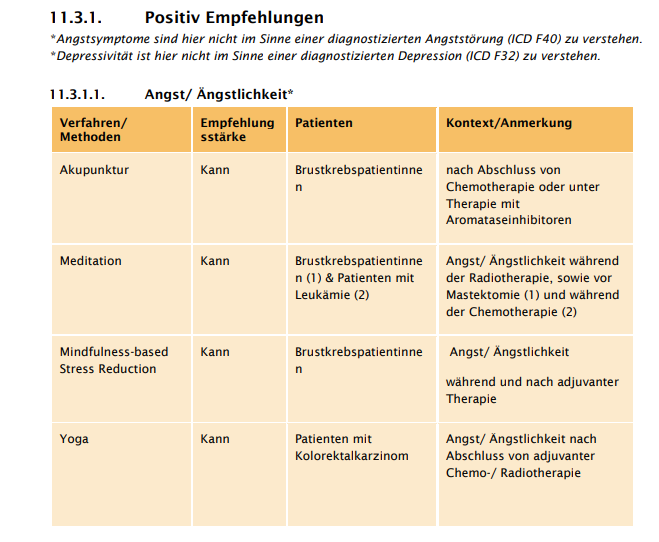 Am Ende der Leitline (ab S. 620) finden Sie eine Übersicht in Tabellenform zu Krebsbedingten Symptomen und komplementären Verfahren. Es gibt sowohl Positiv Empfehlungen als auch Negativ Empfehlungen, diese finden Sie in der Leitlinie auf den Seiten 620 und 627, aber auch in unserer Bildleiste rechts.