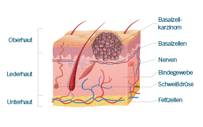 Das Basalzellkarzinom wächst langsam über Jahre bis Jahrzehnte an und bildet sich vor allem auf „Sonnenterrassen“ aus - das sind besonders sonnenexponierte und -empfindliche Hautareale.