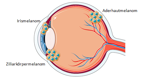 Das Aderhautmelanom stellt für Erwachsene einen der häufigsten Tumore des Auges dar. Ursächlich ist eine bösartige Vermehrung von Pigmentzellen, die zu ca. 90% im Bereich der Aderhaut und in deutlich selteneren Fällen an der Iris und dem Ziliarkörper zu finden sind (siehe Abbildung 1 (1)).